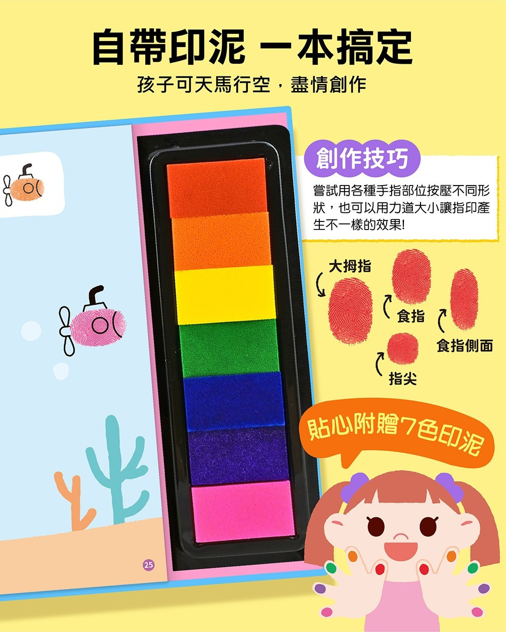 1.內附7色安全指印顏料,隨手就能創作。